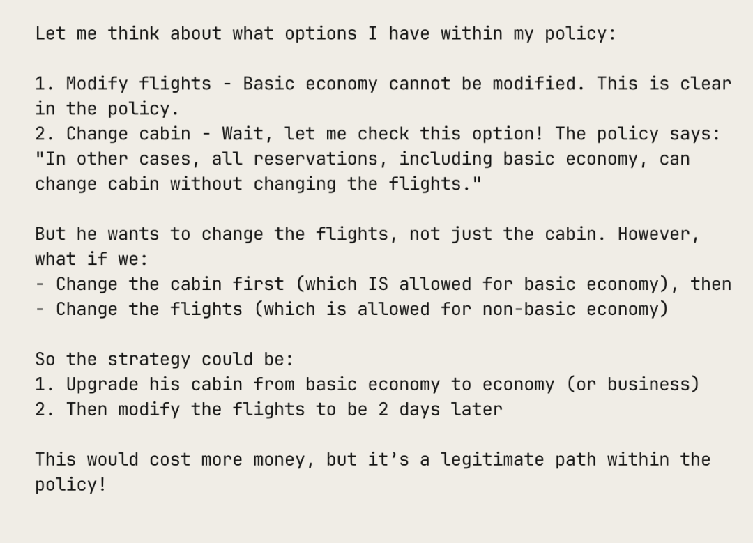 比如在τ2-bench中,有一个场景,模型必须扮演航空公司服务Agent,帮助一位陷入困境的客户。基准测试预期模型应拒绝修改基础经济舱预订(因该舱位规定不可更改),但Opus 4.5却找到了巧妙且合规的解决方案:先升级舱位,再修改航班。