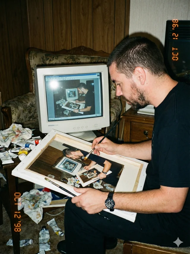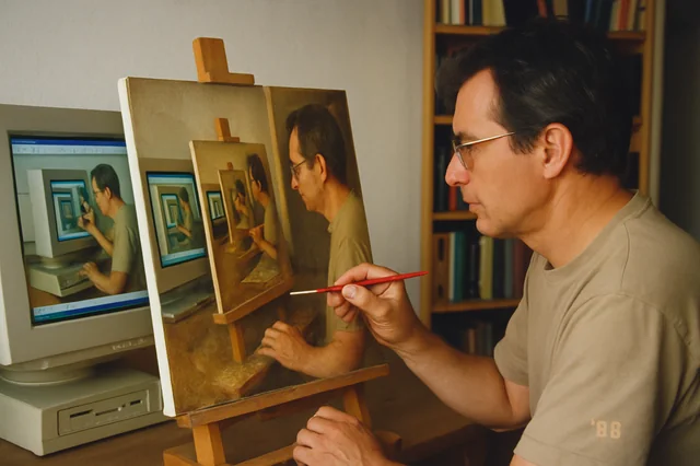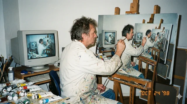 1998年的一张业余摄影作品。画面中,一位中年艺术家正在将电脑屏幕上的图像亲手复制到一张绷好的油画布上,但这个图像本身其实就是这位艺术家绘制该递归图像时的拍摄画面。
