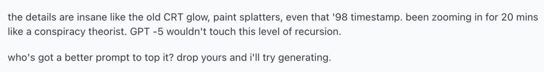 老式显示器发出的光晕,画布下溅上去的颜料,还有画面右下方那个傻瓜相机的时间戳……r/ChatGPT像欣赏一张传世名画一样把这张图放大看了20分钟。
