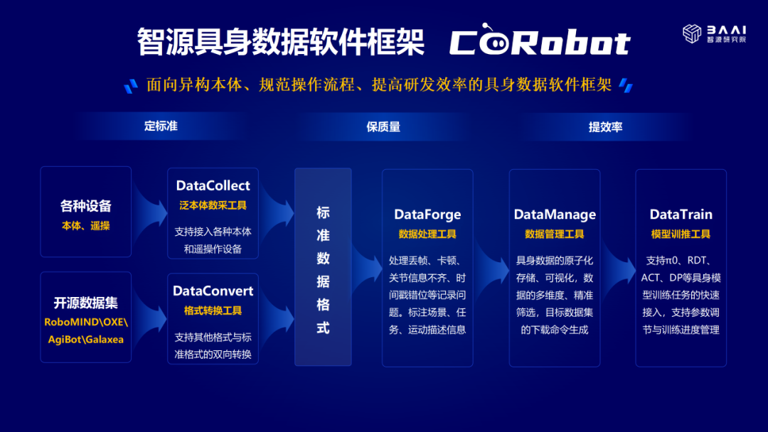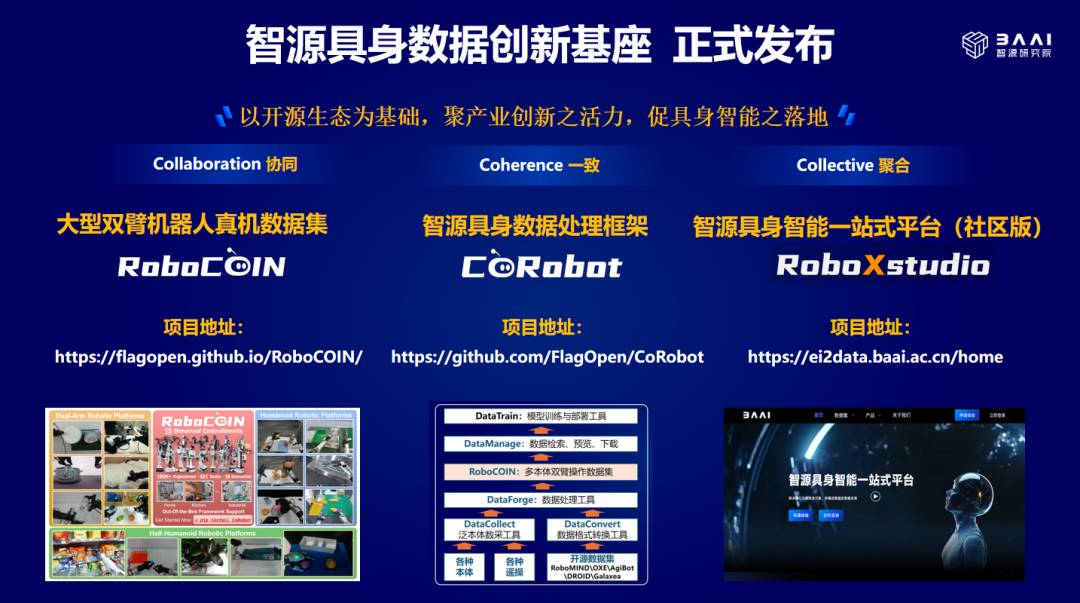 2025年11月20日,北京智源人工智能研究院正式发布具身数据创新基座:智源具身一站式平台RoboXstudio、大型高质量双臂机器人真机数据集RoboCOIN、智源具身数据软件框架CoRobot,推动了具身数据生产效率和质量的全面升级。