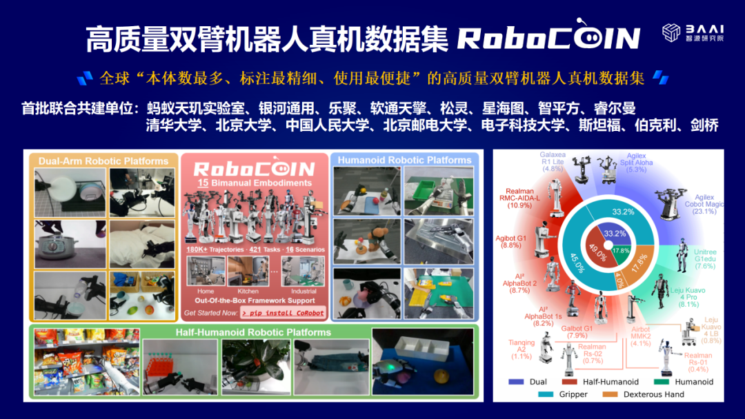基于CoRobot具身数据软件框架,智源研究院联合蚂蚁天玑实验室、银河通用、乐聚、软通天擎、松灵、星海图、智平方、睿尔曼等8家企业,以及清华大学、北京大学、中国人民大学、北京邮电大学、电子科技大学、斯坦福、伯克利和剑桥大学等高校,合作建立了一个全球“本体数最多、标注最精细、使用最便捷”的高质量双臂机器人真机数据集RoboCOIN。