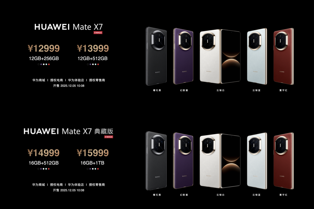Mate X7起售价格则是12999元,高配直接干到15999。