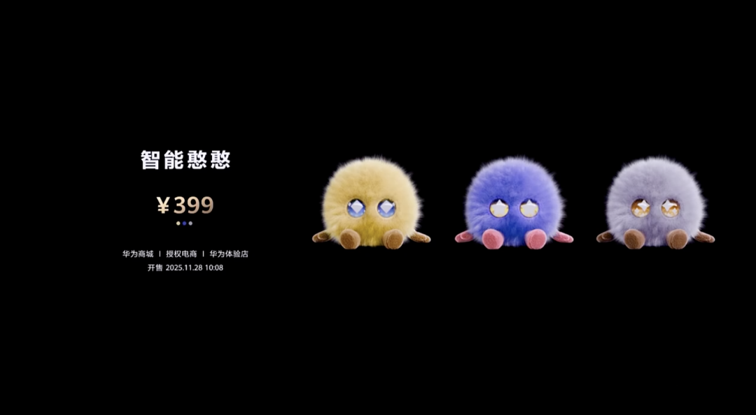 值得一提的是,余承东在发布会中间提到了一款新的电子宠物(AI宠物)——智能憨憨。它有三种颜色可选,399开卖。