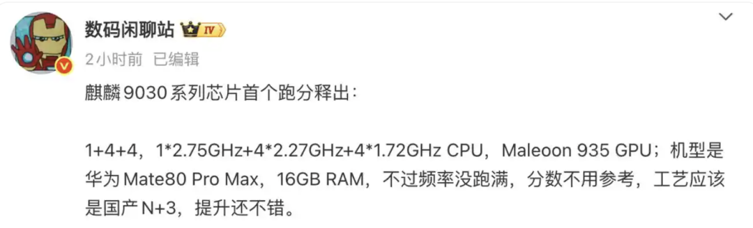 从数码博主“数码闲聊站”稍早前曝光的跑分信息可以看到,麒麟9030的CPU为1+4+4的9核心设计,包括1颗2.75GHz大核,4颗2.27GHz中核以及4颗1.72GHz小核,GPU则采用Maleoon 935,整体来看“提升还不错”。