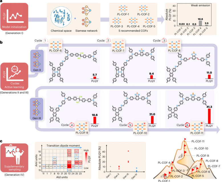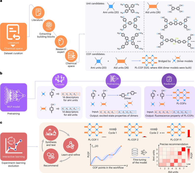 图1. AI辅助迭代实验发现高荧光COF材料流程