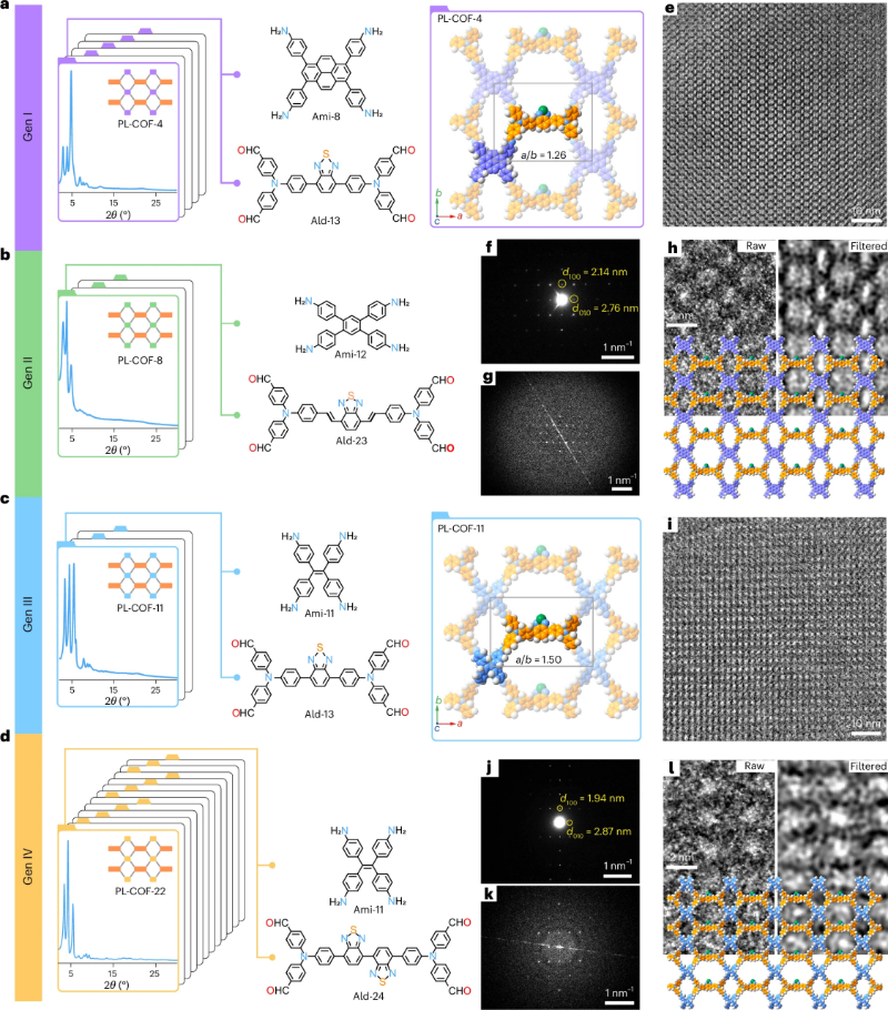 作者随后通过粉末X射线衍射、高分辨透射电镜等手段,详细展示了不同世代中代表性COF(如PL-COF-4, PL-COF-8, PL-COF-11)的晶体结构(图3)。确证了所有合成材料都是结构明确、高质量的COF,为后续建立可靠的结构-性能关系奠定了基础。