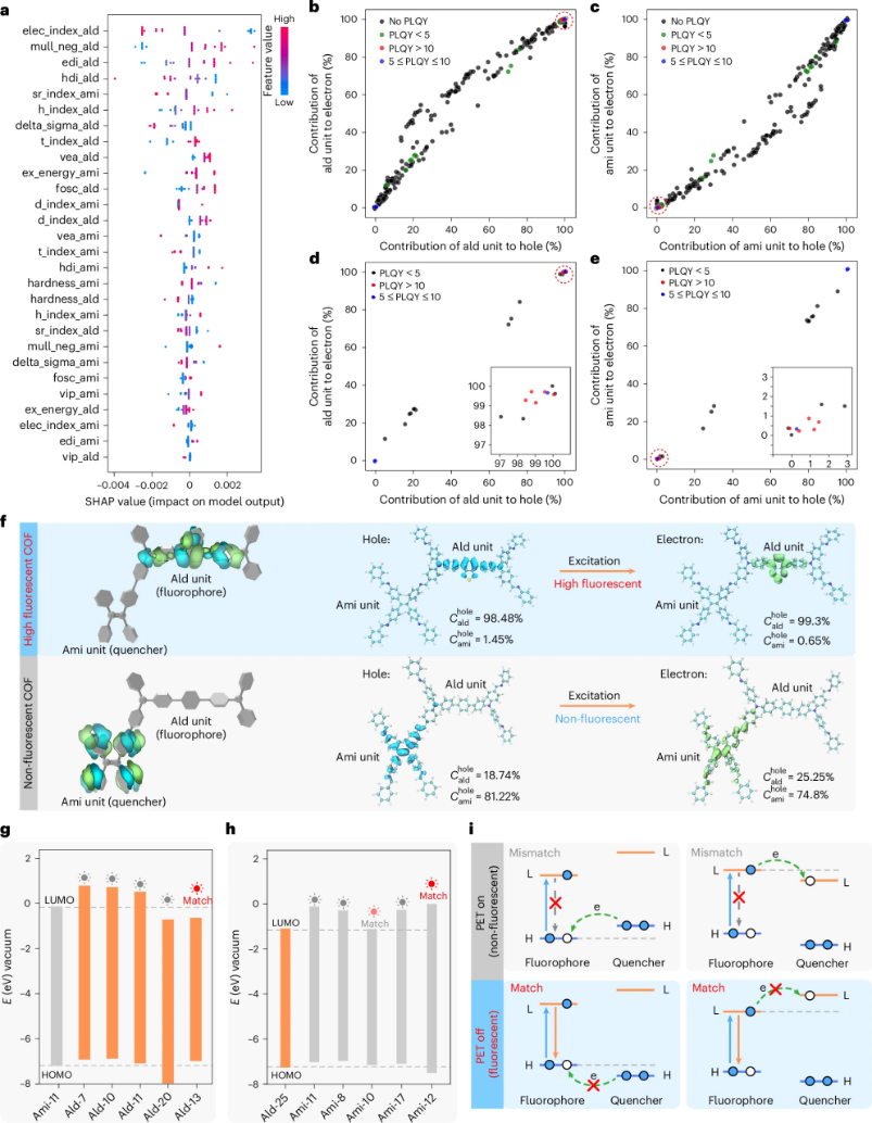 作者随后使用SHAP模型对28个电子描述符进行重要性排序,发现前6个关键描述符中,有5个来自醛单元。例如,醛单元的穆利肯电负性、电子离域指数等对荧光性能有决定性影响(图4a)。作者量化分析了二聚体中醛和胺单元对激发态电子和空穴的贡献百分比。结果显示,高性能COF(红点)集中在图的右上角,即醛单元对电子和空穴的贡献都很大(通常>90%);而胺单元的贡献则很小(图4b)。