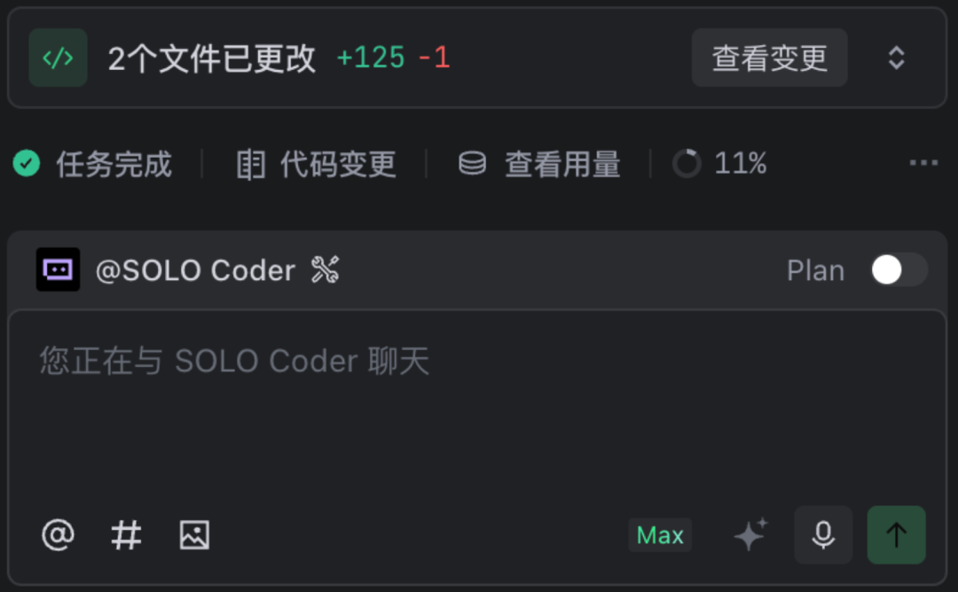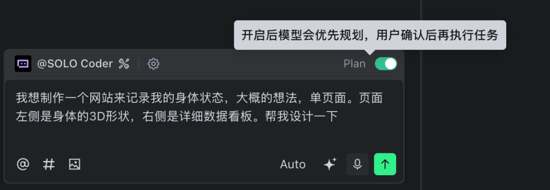 当用户使用SOLO Coder智能体时,用户可以对话时勾选Plan,AI将得到任务后首先输出高质量的计划。