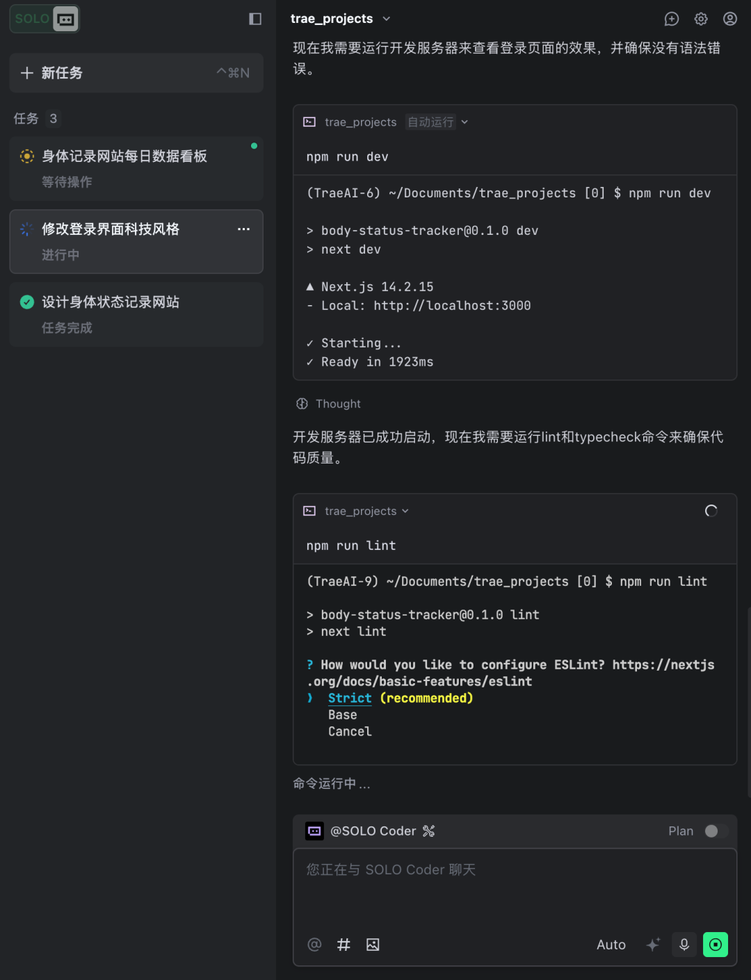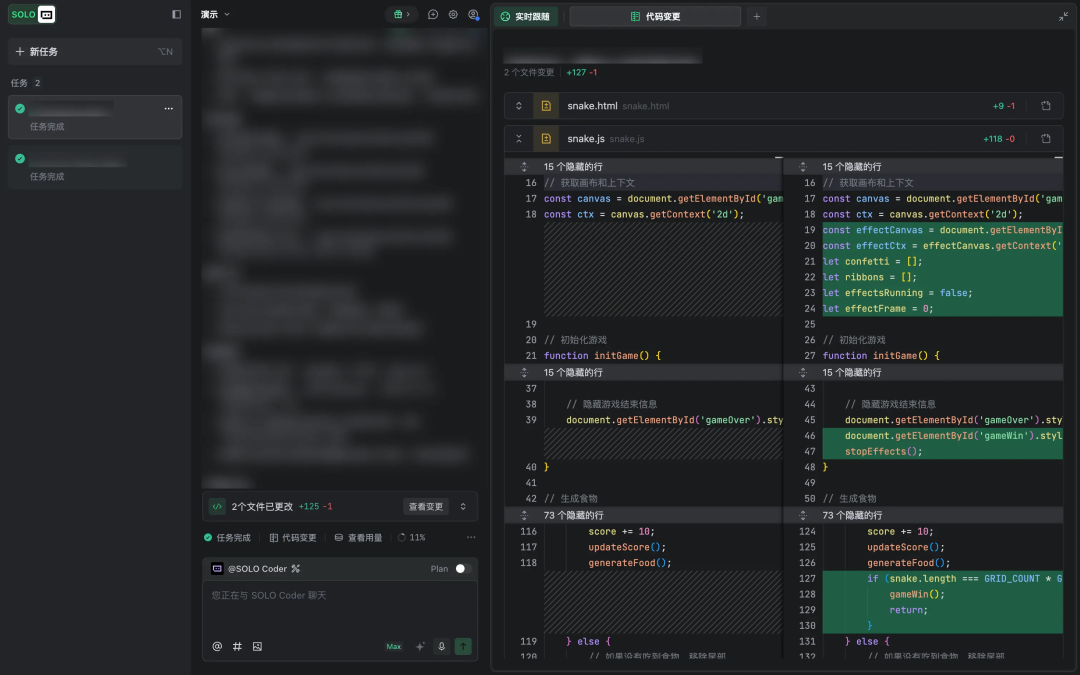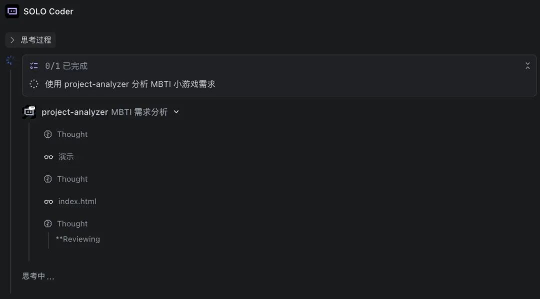 SOLO Coder在完成一个关键步骤或功能模块后,会自动将过程折叠成一个简洁的摘要,让复杂执行过程条理清晰,AI执行过程一目了然。