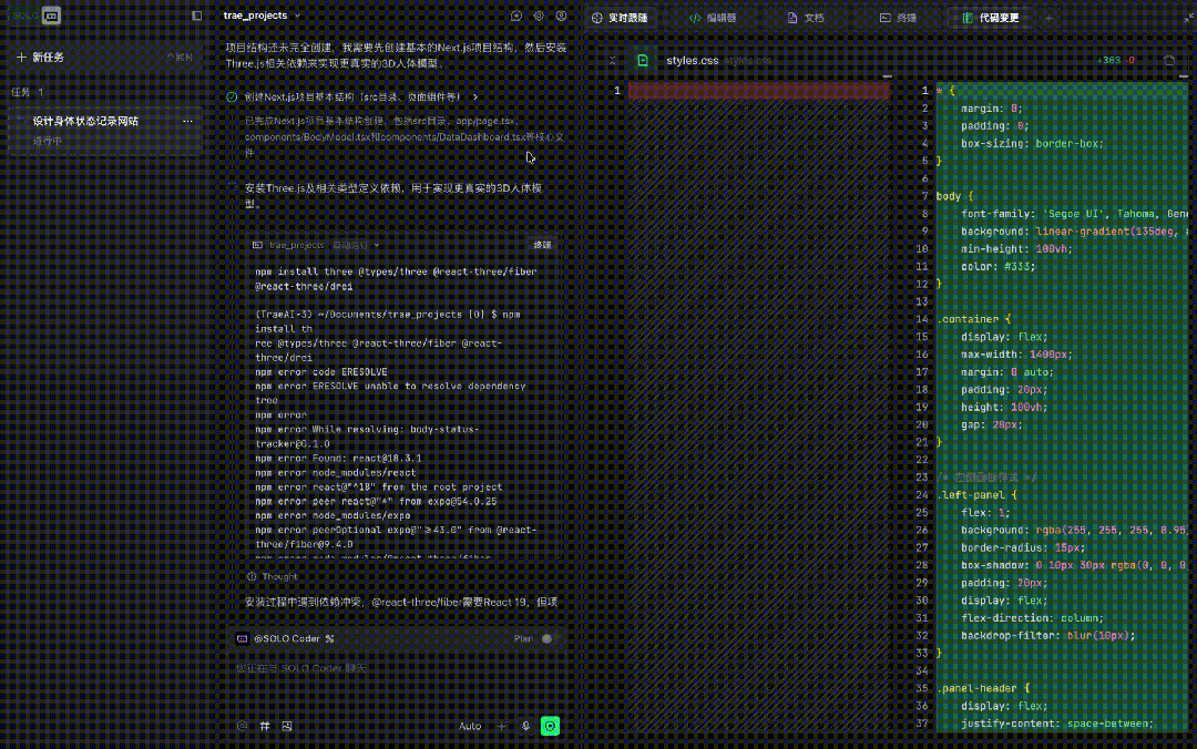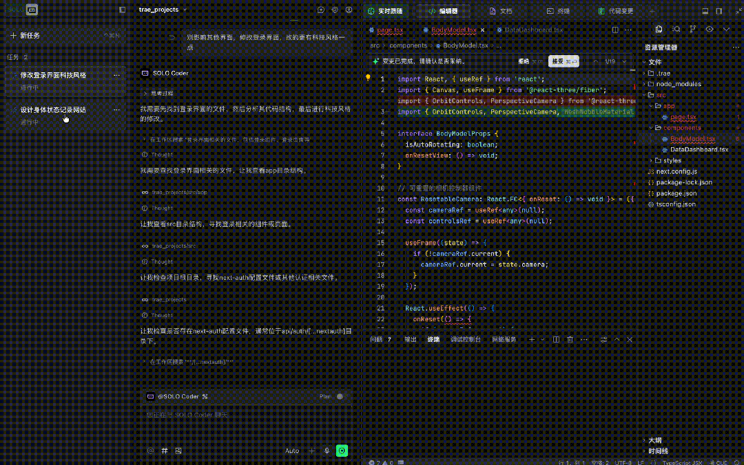 通过全新三栏布局和代码变更工具,TRAE SOLO实现了它设计的第二个理念:编码过程「实时有感知」。