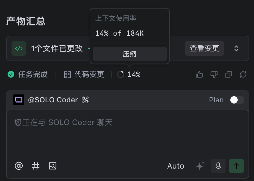 SOLO Coder带来了更好的上下文管理:当前在用户多轮提问后,由于上下文变长,模型容易失焦,从而产生幻觉,影响AI效果。用户可以压缩上下文功能管理及精炼上下文,提升模型输出效果。