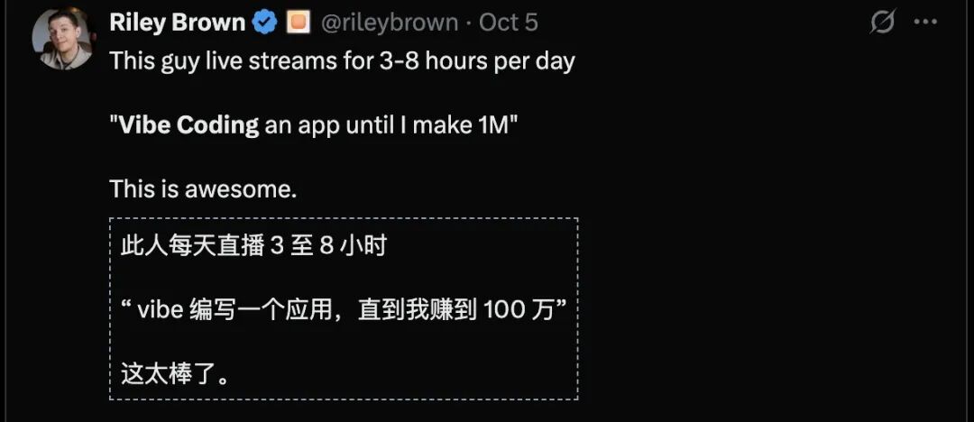 很多大佬们甚至直播用氛围编程写应用,直到赚到100万才下播,而且还成功了。