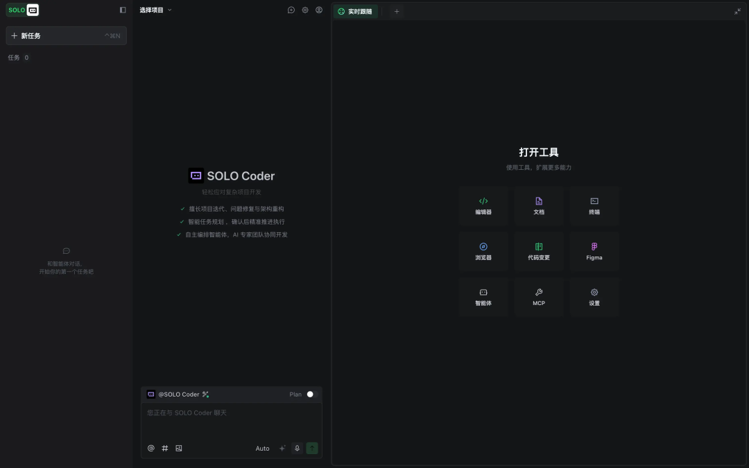 SOLO模式的界面如下,从左到右依次为任务管理面板、AI对话面板、工具面板。