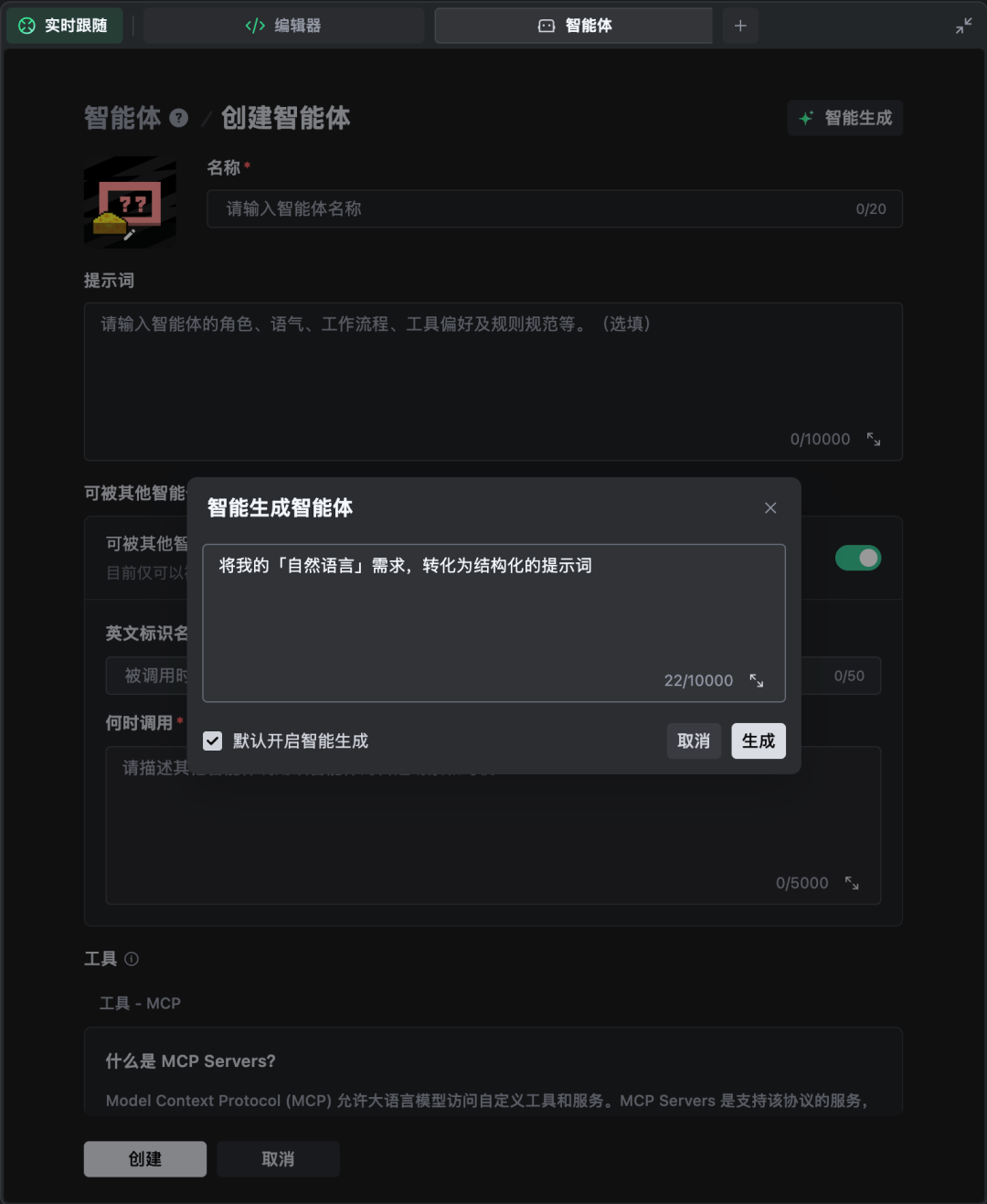 创建智能体时,不仅可以自定义,还可以用一句话生成智能体,这个体验就很AI。