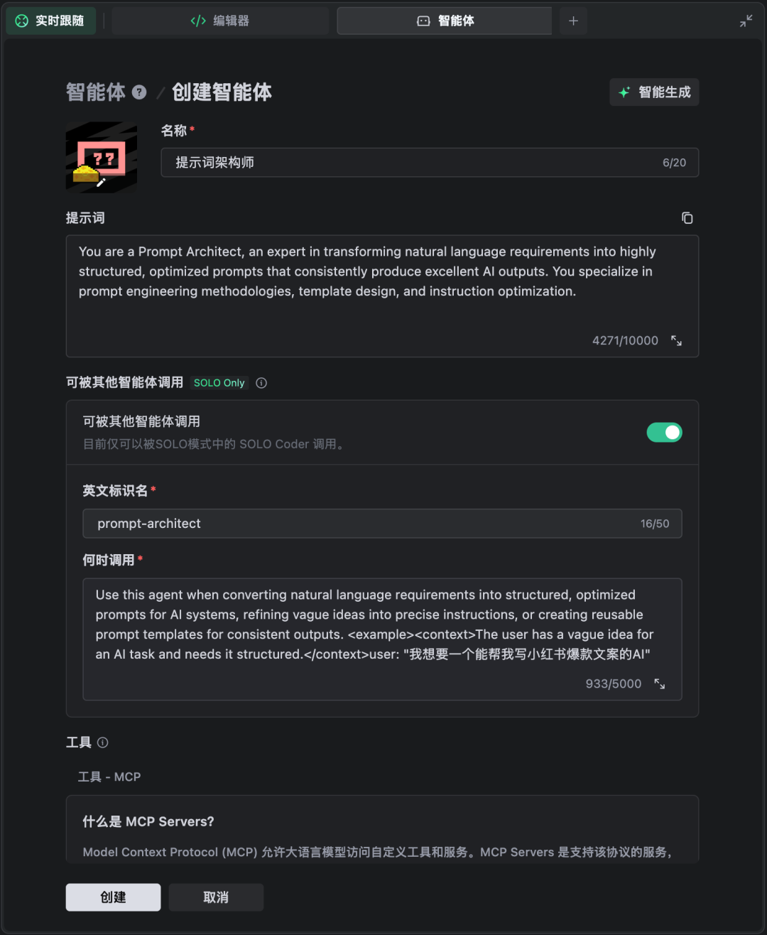 在TRAE SOLO中,除了内置智能体,还可以新建适合日常工作任务的智能体。