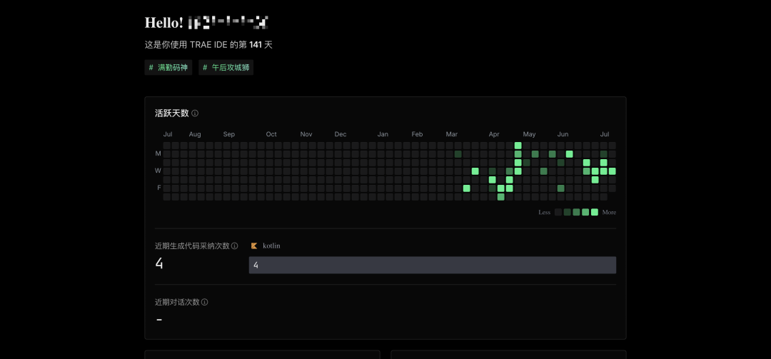 TRAE还有一个仪表盘功能,和Github同款的热力图。