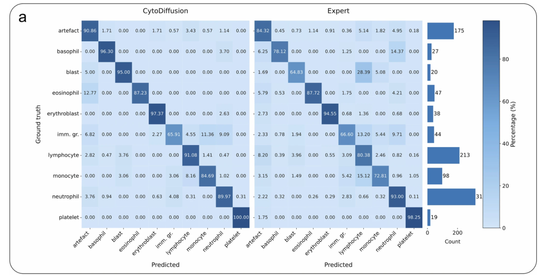 CytoData 对比:左侧矩阵显示 CytoDiffusion 的结果,右侧矩阵显示人类专家的平均性能