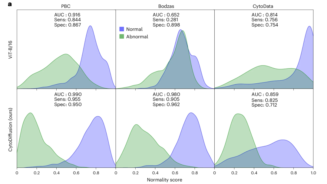 对于异常细胞检测,在 Bodzas 数据集中,以原始细胞作为异常类别时,CytoDiffusion 实现了高敏感性(0.905)和高特异性(0.962)。相比之下,ViT 的敏感性极低(0.281),明显无法满足临床应用需求,如下图: