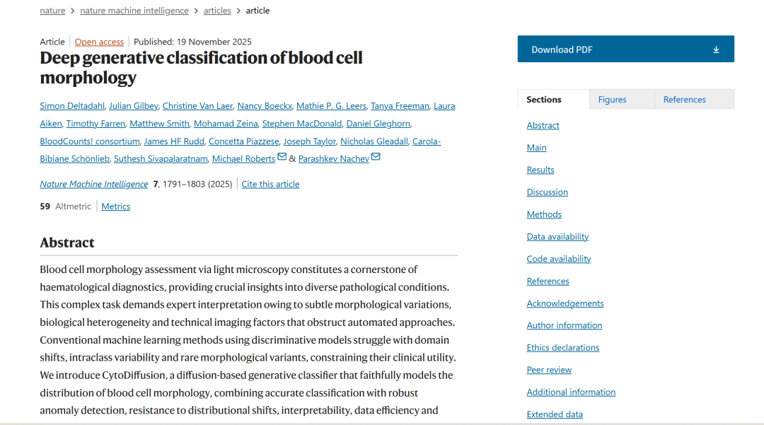 相关研究成果以「Deep generative classification of blood cell morphology」为题,已刊登 Nature。