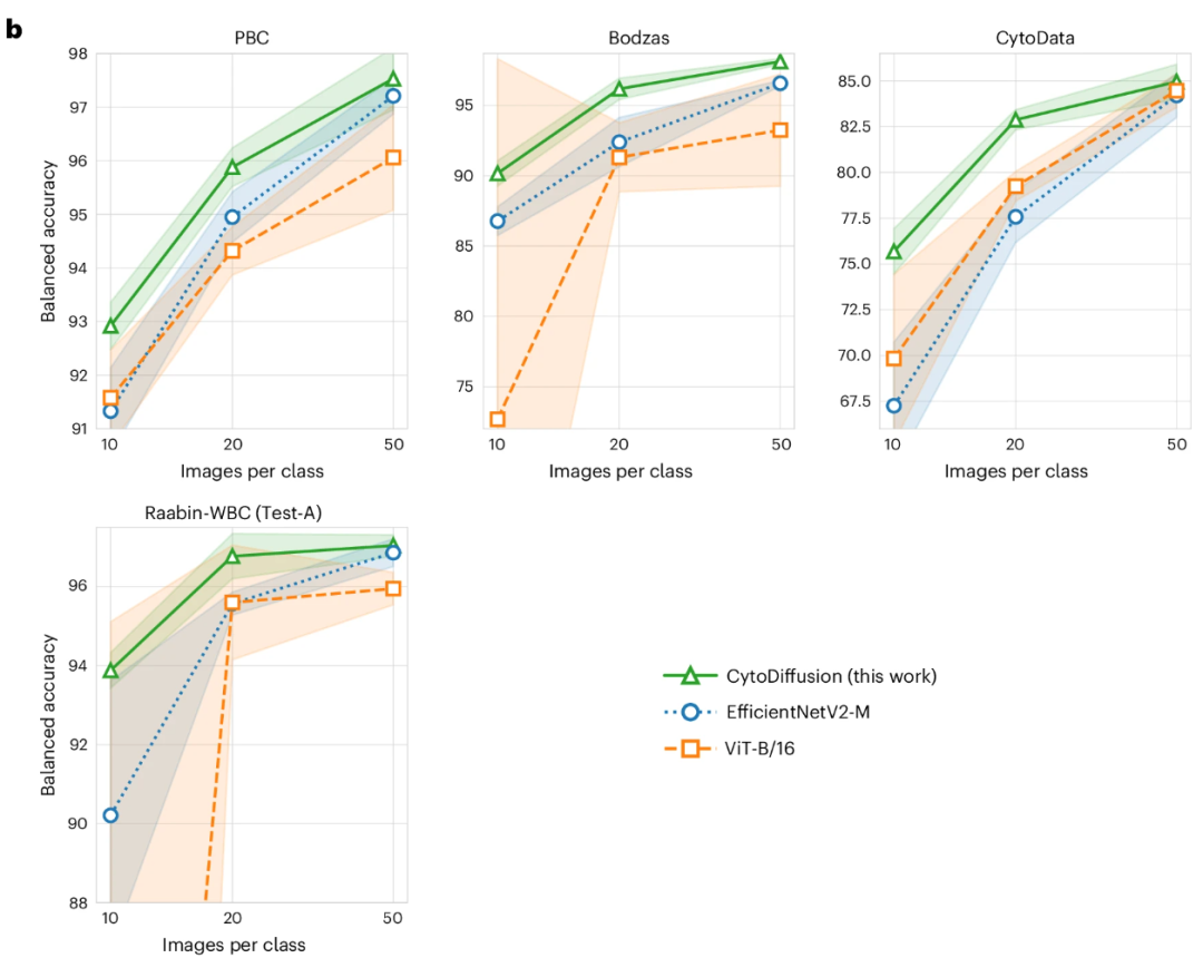 对于低数据环境,在每类仅 10–50 张训练图像情况下,CytoDiffusion 显著优于 EfficientNetV2-M 与 ViT-B/16,展示了数据稀缺条件下的高效学习能力,如下图: