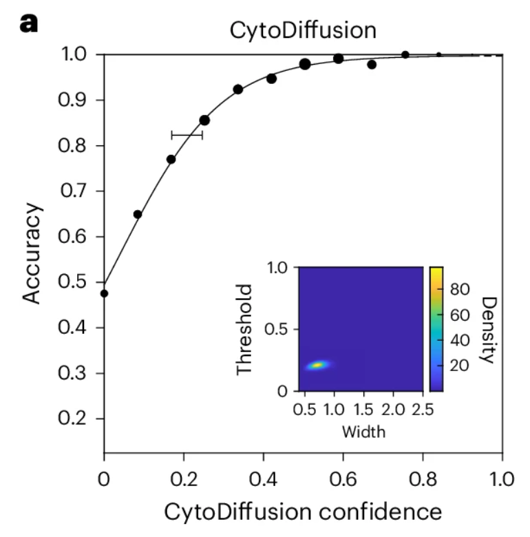 研究人员使用已建立的贝叶斯心理计量建模技术推导 CytoDiffusion 的心理计量函数,如下图,结果显示模型拟合优异,关键阈值与宽度参数的后验分布都非常紧致(下图内嵌坐标轴)。尽管无法直接测量,但这些结果表明 CytoDiffusion 的不确定性主要由偶然成分主导,其行为接近理想观察者的表现。