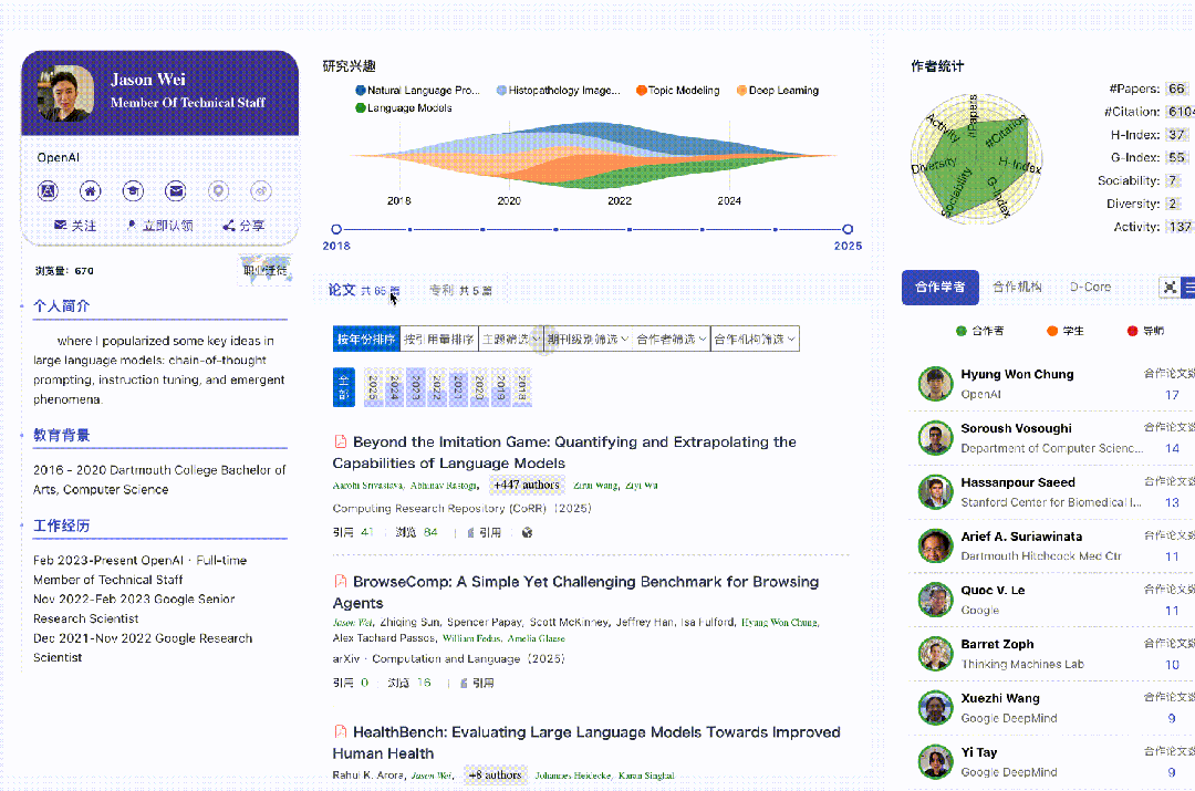 从 WhoIsWho 基准数据集的构建到多模态消歧算法的实现,从实时成果更新到深度影响力挖掘,AMiner 亮点的每一项功能都源于扎实的学术研究与真实的用户需求。