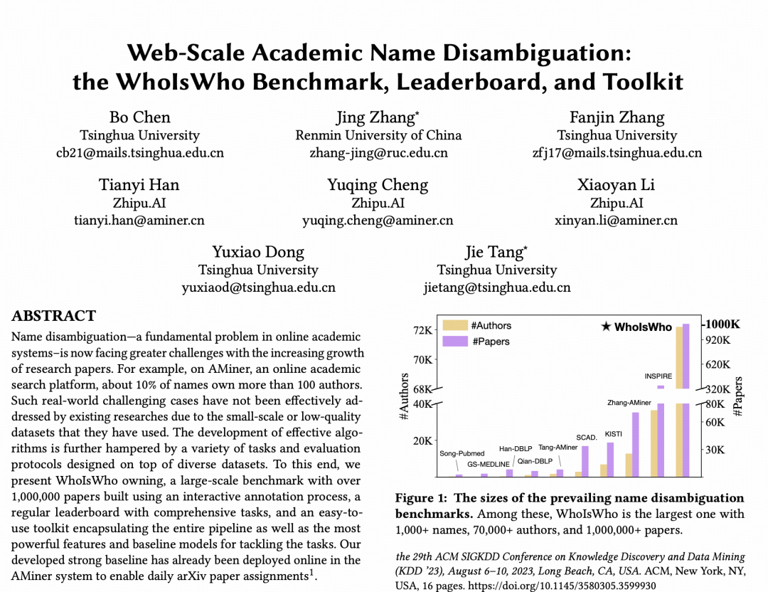 AMiner 团队构建的 WhoIsWho 基准数据集,包含超过 100 万个学术论文、7 万名作者和 1000 余个高歧义姓名,是目前规模最大的手动标注学术姓名消歧数据集。