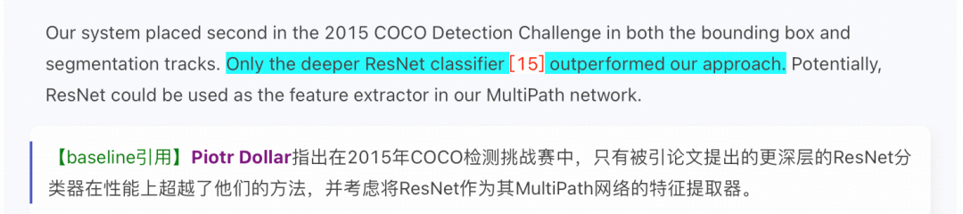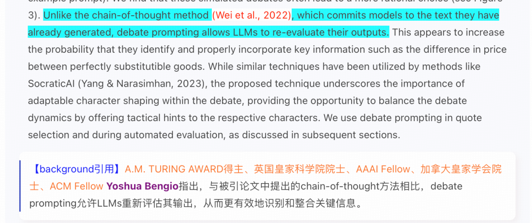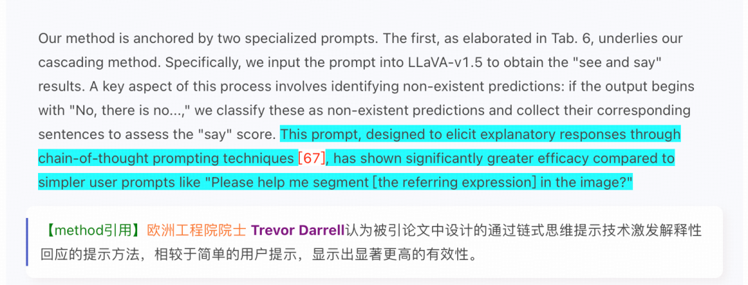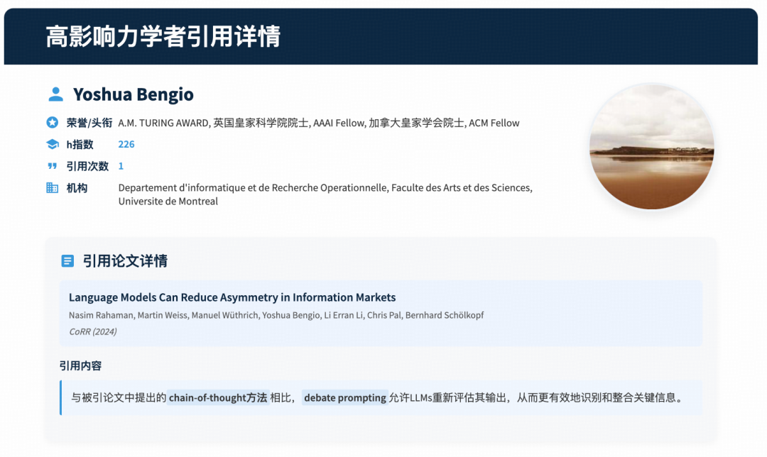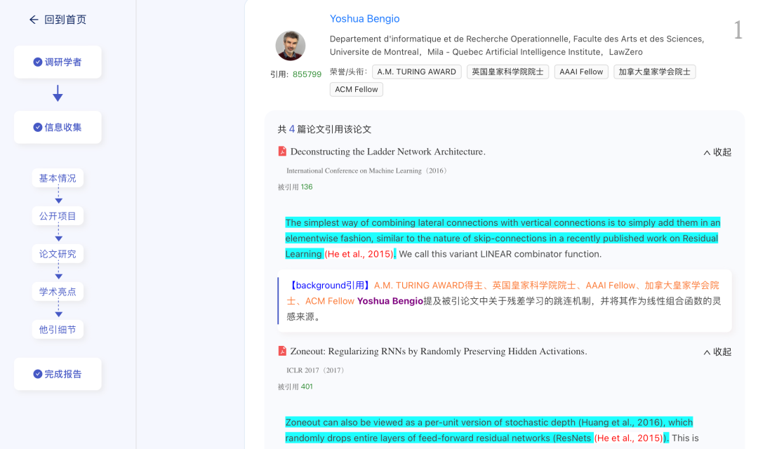 权威引用溯源:自动识别引用者的学术头衔、荣誉资质(如诺贝尔奖、图灵奖得主),呈现其对成果的具体评价与应用场景。例如,清晰展示何恺明教授的论文被 Yoshua Bengio 等领域大牛引用的句子级溯源,且进一步补全评价感情色彩: