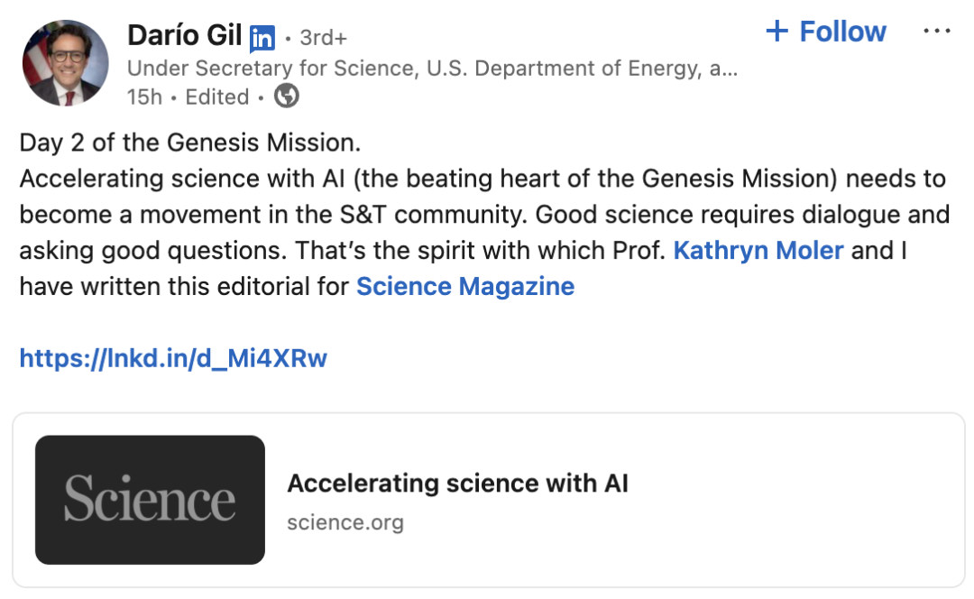 美国能源部科学事务副部长兼「创世纪计划」项目主任Darío Gil,联手斯坦福大学教授Kathryn A. Moler,在《科学》(Science)杂志发表社论,点题只有一句话: