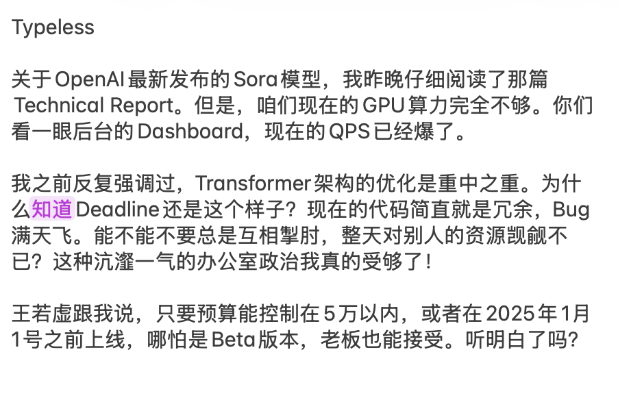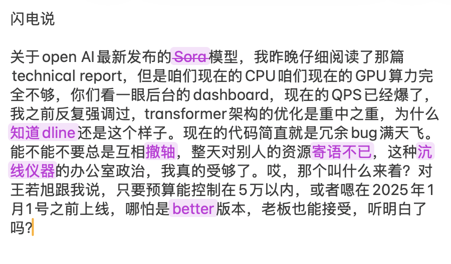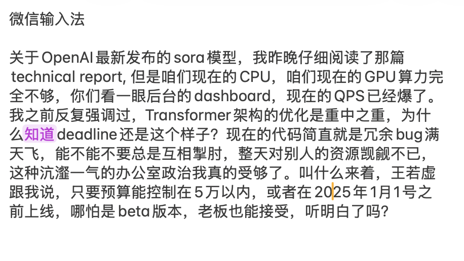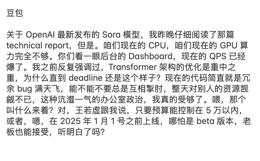 关于 OpenAI 最新发布的 Sora 模型,我昨晚仔细读了那篇 Technical Report。但是!咱们现在的 GPU 算力完全不够!你们看一眼后台的 Dashboard,现在的 QPS 已经爆了!我之前反复强调过,Transformer 架构的优化是重中之重,为什么直到 Deadline 还是这个样子?现在的代码简直就是冗余!Bug 满天飞!能不能不要总是互相 掣肘,整天对别人的资源 觊觎不已?这种 沆瀣一气的办公室政治,我真的受够了!唉,那个…… 叫什么来着…… 对,王若虚跟我说,只要预算能控制在 ¥50,000.00 以内,或者…… 嗯…… 在 2025 年 1 月 1 号 之前上线,哪怕是 Beta 版本,老板也能接受。听明白了吗?