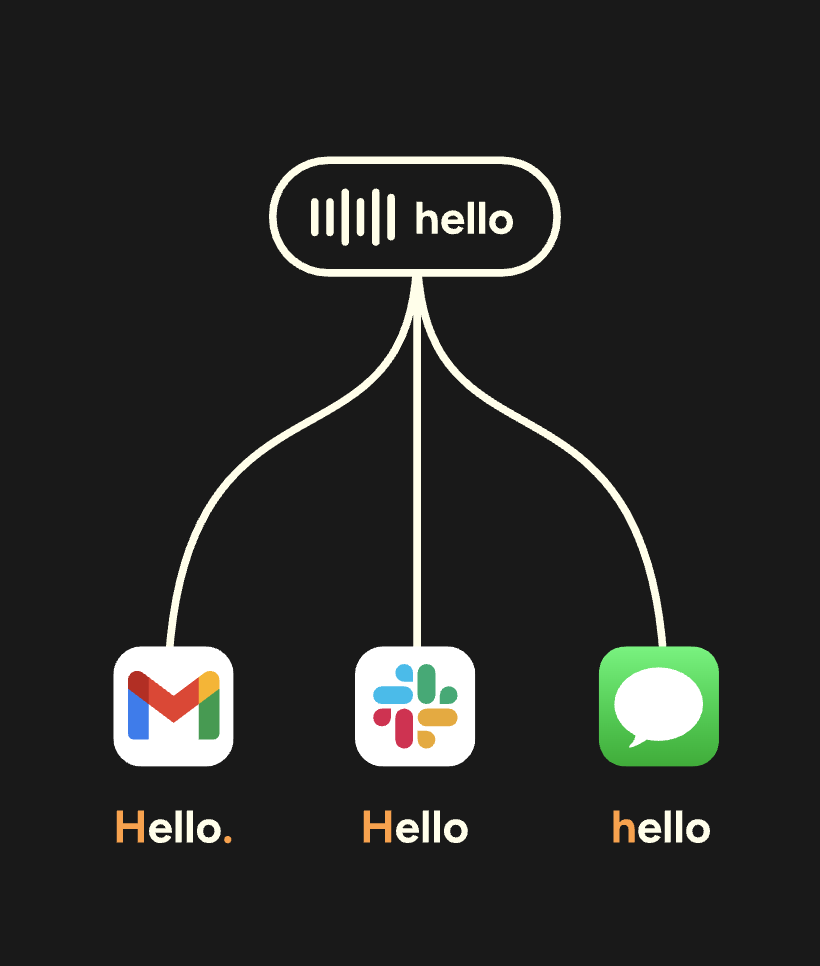 同样是一个「hello」,在 Gmail 中最正式,大写开头、带标点;在短信中最随意|图片来源:Wispr