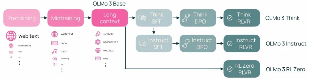 本文推出了 Olmo 3,这是一个在 7B 和 32B 参数规模下处于业界领先水平的完全开源语言模型系列。Olmo 3 的模型构建旨在实现长上下文推理、函数调用、编程、指令遵循、通用对话以及知识召回等能力。此次发布包含完整的模型流水线(model flow),即该模型系列从构建到部署的全生命周期,涵盖所有训练阶段、检查点(checkpoint)、数据点(datapoint)以及依赖项。