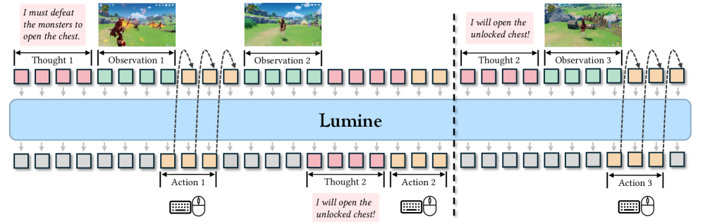 本文提出 Lumine,这是首个开源的通用智能体开发方案,能够实现在复杂三维开放世界环境中实时执行长达数小时的复杂任务。该模型采用类人类交互范式,通过视觉-语言模型,以端到端的方式统一感知、推理与行动。它以每秒 5 帧的频率处理原始像素输入,生成每秒 30 帧的精确键盘鼠标操作,并仅在必要时动态调用推理模块。