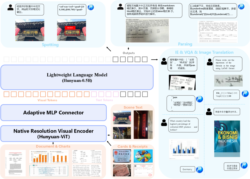 本文提出 HunyuanOCR,一个面向 OCR 任务的商用级、开源且轻量级(10 亿参数)视觉-语言模型(VLM)。该模型架构由原生视觉 Transformer(ViT)与轻量级大语言模型(LLM)通过 MLP 适配器连接而成。HunyuanOCR 展现出卓越的性能,超越了现有商业 API、传统处理流程以及参数量更大的模型(如 Qwen3-VL-4B)。