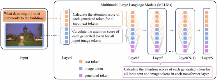 对于每个生成token,我们计算其在所有Transformer层上对输入文本token和图像token的平均注意力分数,然后对所有生成的token的这些分数取平均值。
