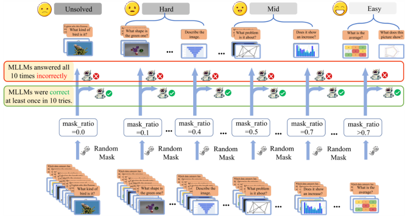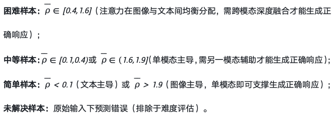 多模态数据包含视觉与文本双重特征,文本模态难度常无法直接表征多模态样本整体难度(如OCR、目标检测等任务),因此无法沿用纯文本数据的难度划分方式,导致难以筛选对模型优化具有高价值的训练样本。