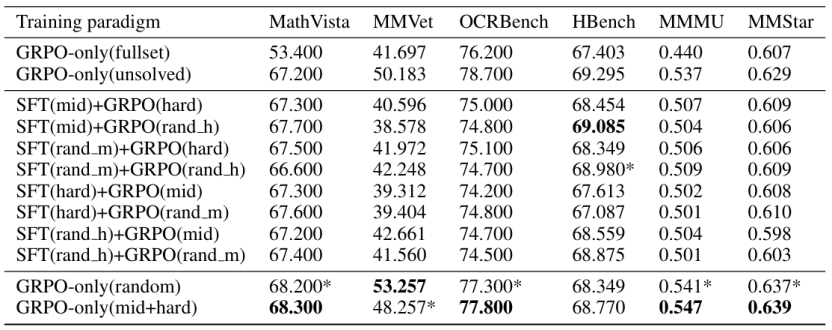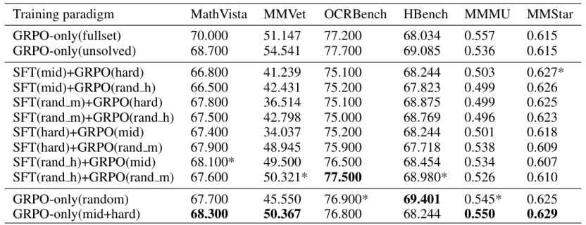 GRPO-only(随机样本)虽在部分指标(如MMVet)表现较好,但整体低于中等+困难样本训练结果,验证了难度分层对样本质量筛选的有效性。