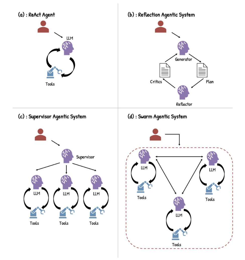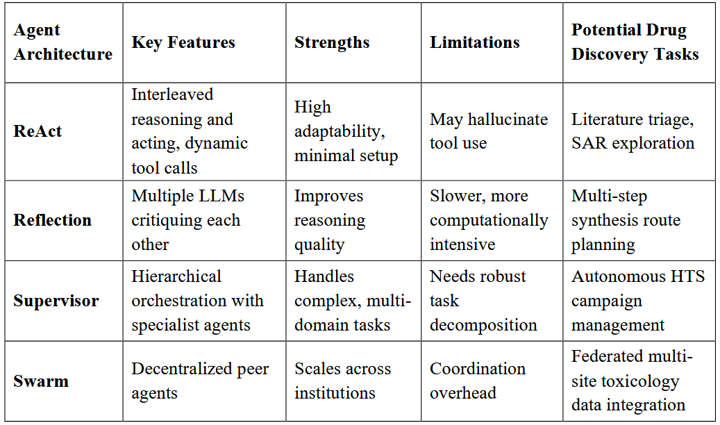 图3展示了常见的AI智能体架构。ReAct智能体是一个由推理与行动组成的循环,其中LLMs会动态选择并调用工具(图3a)。Reflection智能体系统由多个LLMs构成,其中一个Generator负责提出方案,另一个Reflector对方案进行批判,并通过迭代不断优化策略(图3b)。Supervisor智能体系统是一种层级化多智能体架构,由监督者LLMs将子任务分配给专门化LLMs智能体,每个智能体都具备推理与调用工具的能力(图3c)。Swarm智能体系统是一种去中心化的多智能体系统,其中所有智能体彼此相连,每个智能体都具备推理与调用工具的能力(图3d)。表1总结了每种智能体系统在药物发现中的关键特征、优势/局限性以及适用任务。