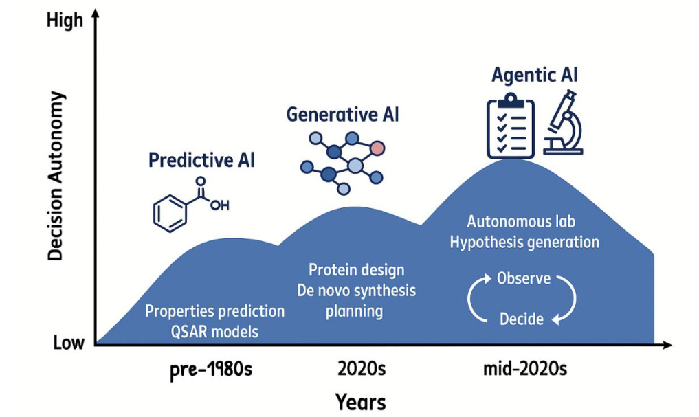 以机器学习为代表的预测型AI已使QSAR模型在定量乃至定性的层面上取得了显著提升。生成式AI使设计具有特定理化性质的新化学结构成为可能,而LLMs则能够结构化机器可读的数据,用于提出科学假设(图1)。然而,这些范式仍存在共性局限:它们属于被动式系统,需要人为执行重复性任务,例如准备输入、解释输出等。更重要的是,它们无法在药物发现这种复杂且高度耦合的工作流中自主协调多步骤推理与决策。