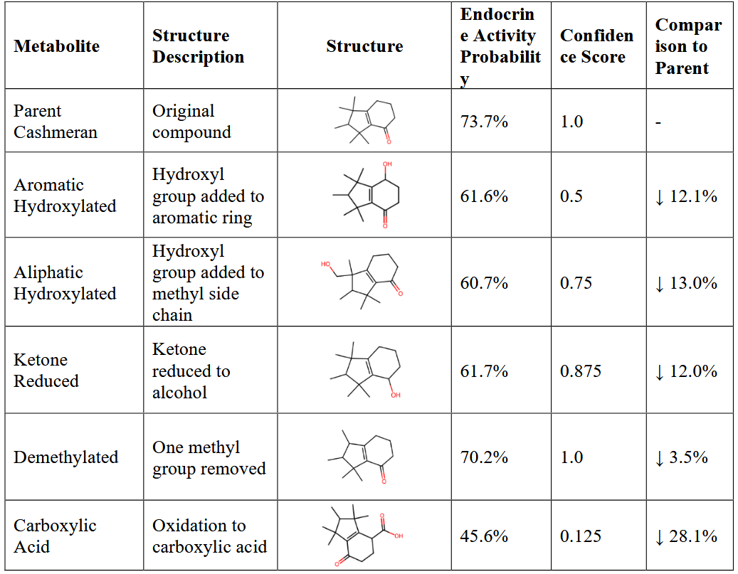 AI智能体系统还使用其化学信息学工具生成了Cashmeran的预测代谢物,并对这些代谢物重复进行了危害预测。表4汇总了AI智能体系统生成的结果。