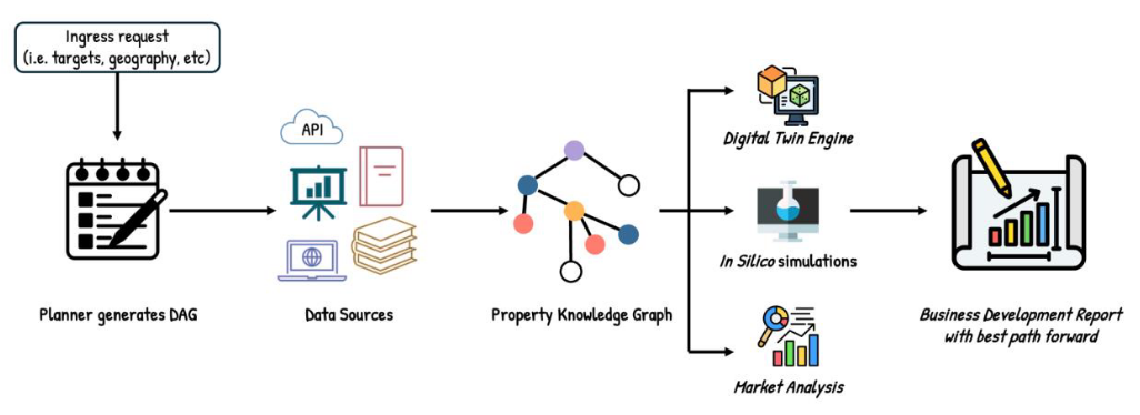 在此案例中,Convexia Bio的作者开发了一个用于小分子资产搜索与评估的智能体工作流程(图12)。具体来说,规划器构建任务,将数据源的输入整合至每个查询的资产知识图谱(PKG)中。PKG支撑科学、临床及战略模块,实现数字孪生模拟、体外计算分析及市场建模。最终将洞察整合为商业开发报告,推荐最佳许可或合作路径。