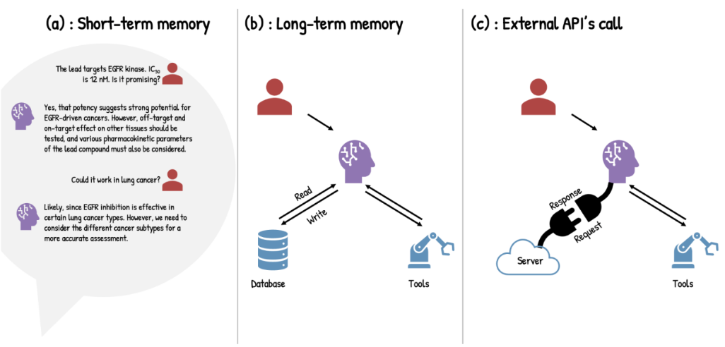 智能体的记忆使其能够从经验中学习、保持连贯的交互,并完成复杂任务。智能体的记忆通常分为两类:短期记忆,用于保存即时情境的工作空间(图4a);长期记忆,用于保持持久知识。为了永久保留信息,智能体会使用长期记忆,其形式包括内部长期记忆与外部长期记忆两类。内部长期记忆指的是在初始训练过程中,被编码进神经网络权重中的参数化知识。而外部长期记忆(图4b)提供一种动态且持久的存储方式,通常通过检索增强生成(RAG)系统实现。由于药物发现领域的科学文献和数据快速增长,AI智能体必须通过主动与数据源及其他智能体交互来扩展其记忆。利用一种称为工具调用的机制(图4c),通过API与外部数据库与服务进行交互,使其能够查询数据库, 并将查询结果纳入其短期记忆。