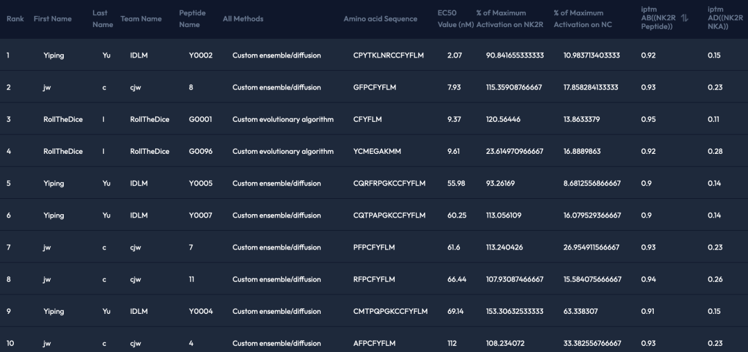 AI多肽设计第一轮比赛结果已公布!在已完成的实验测试中,活性最强的参赛序列EC50达 2 nM,已超越天然多肽 NKA 的水平,充分展示了AI驱动多肽药物设计的巨大潜力。