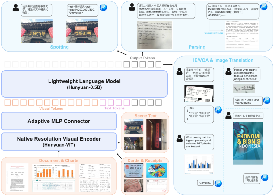 HunyuanOCR采用由原生分辨率视觉编码器、自适应MLP连接器和轻量级语言模型构成的协同架构。