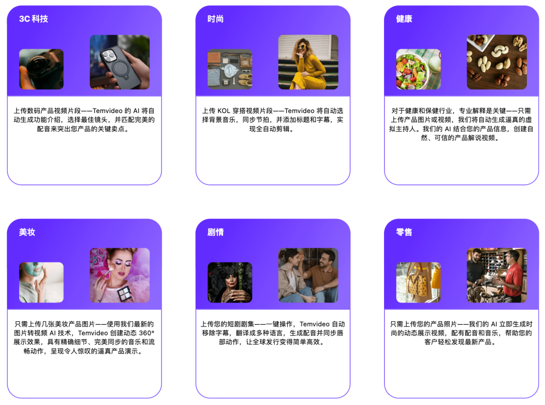 4、商户的高细节要求,如AI自动切分素材镜头、AI识别画面匹配BGM等,很多通用化产品无法满足,Temvideo用“大模型+行业模型”的整体框架去补充。