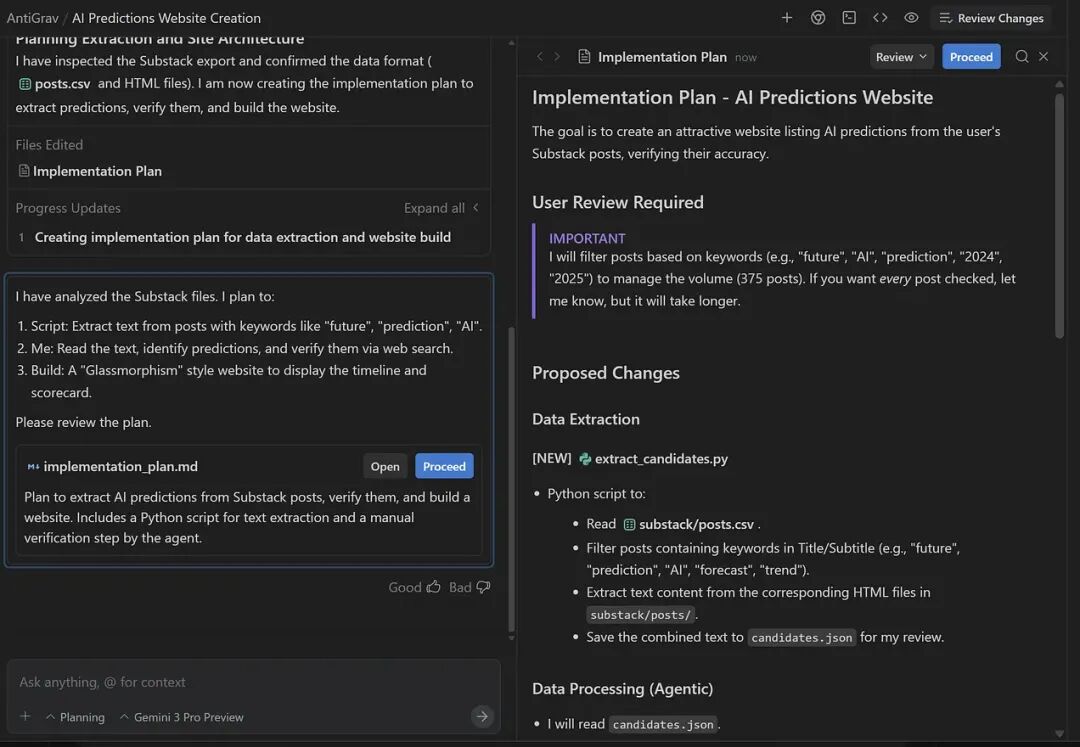 Gemini 3接过任务后,开始自动读取文件、扫描内容、比对上下文,然后弹出一个行动计划让你确认——