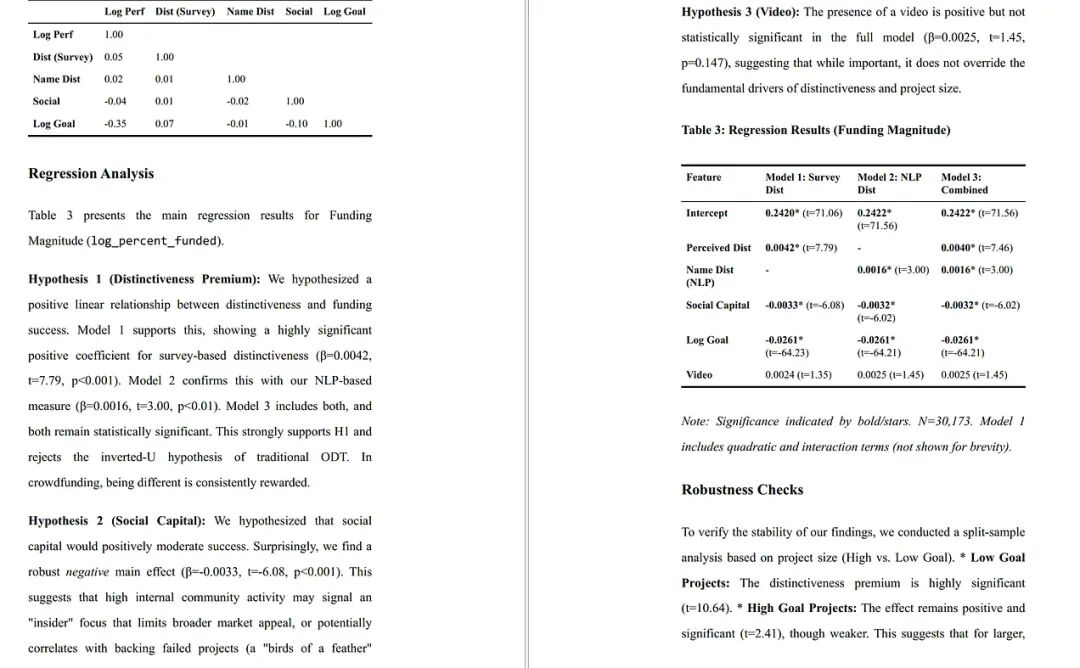 它提出了一个能与现有文献对话的假设,设计合适的统计模型,跑完数据,生成结果,再把整套内容写成了一篇14页的完整论文,包含摘要、理论、方法、数据描述、回归表格、讨论与局限。