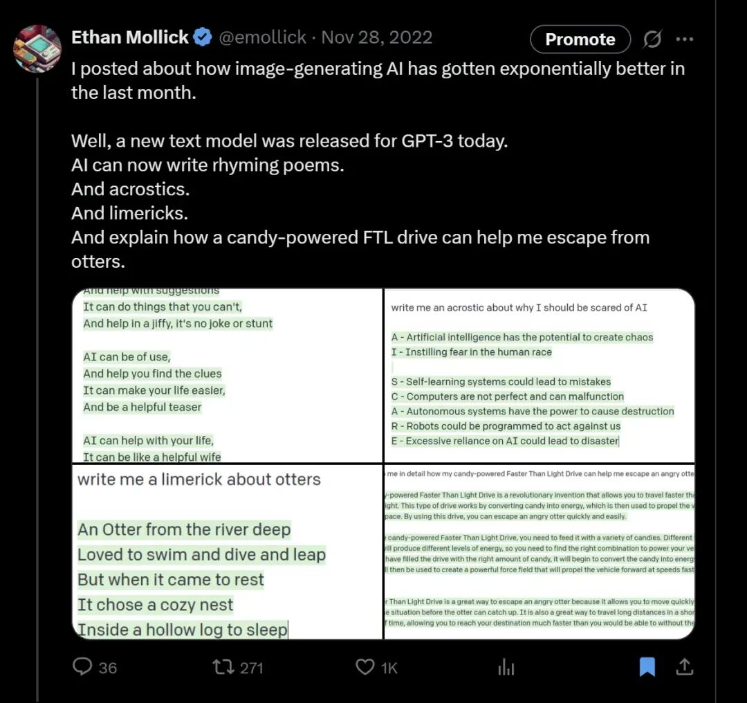 Mollick之后在文中也承认,当年他第一次感到震撼,是因为「AI 居然能写得这么顺」。