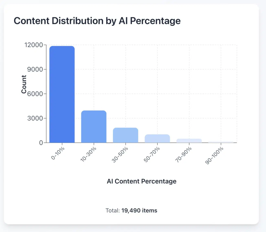 在一个已知完全由人类撰写的对照语料上,EditLens把纯人类写作内容错判成AI润色过的内容的误报率,差不多是1/1000;错判成中等程度AI编辑/辅助内容的误报率是1/50000;错判成AI重度参与的错误率是1/100000。