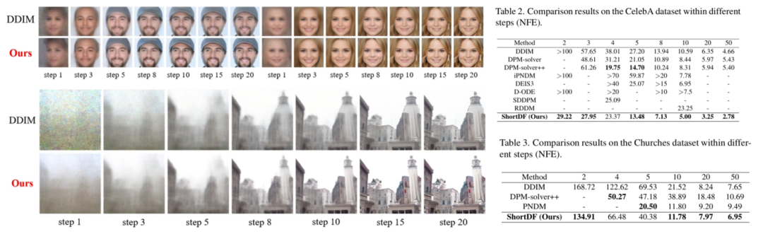 其中可视化结果显示,在相同的去噪时间节点(step是time node)上,ShortDF能更快地还原物体轮廓(如教堂尖顶、人脸五官),验证了“最短路径”理论在复杂分布下的有效性。